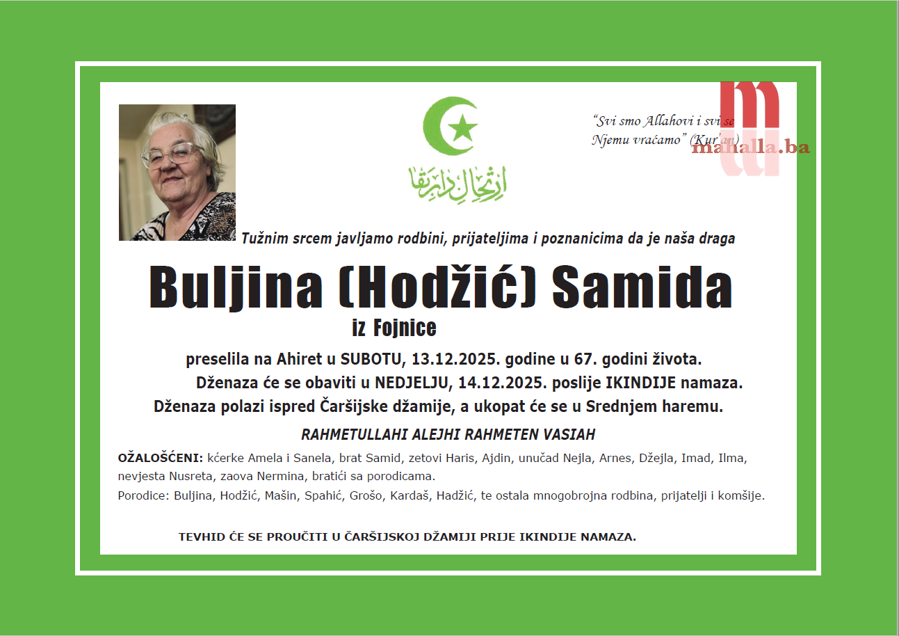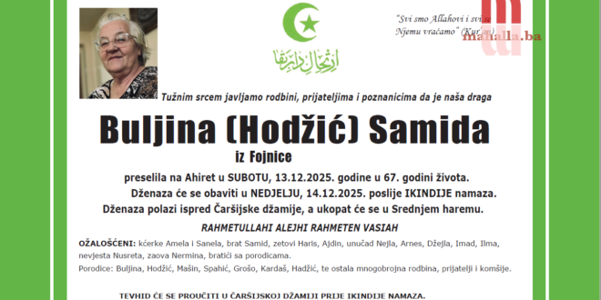 Dženaza-namaz će se klanjati i ukop obaviti u nedjelju, 14.12.2025. godine, poslije ikindije-namaza.