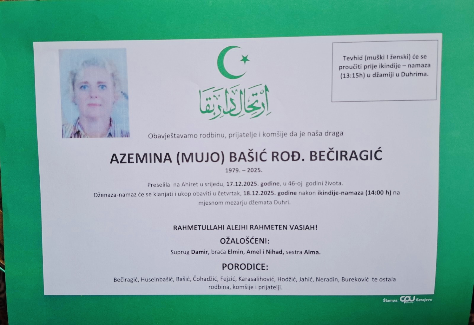 Dženaza-namaz će se klanjati i ukop obaviti u četvrtak, 18. 12. 2025. godine nakon ikindije-namaza (14:00 h) na mjesnom mezarju džemata Duhri.