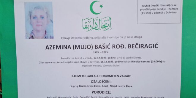Dženaza-namaz će se klanjati i ukop obaviti u četvrtak, 18. 12. 2025. godine nakon ikindije-namaza (14:00 h) na mjesnom mezarju džemata Duhri.