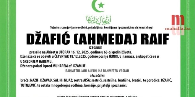 Na Bolji svijet je preselio DŽAFIĆ (AHMEDA) RAIF iz Fojnice