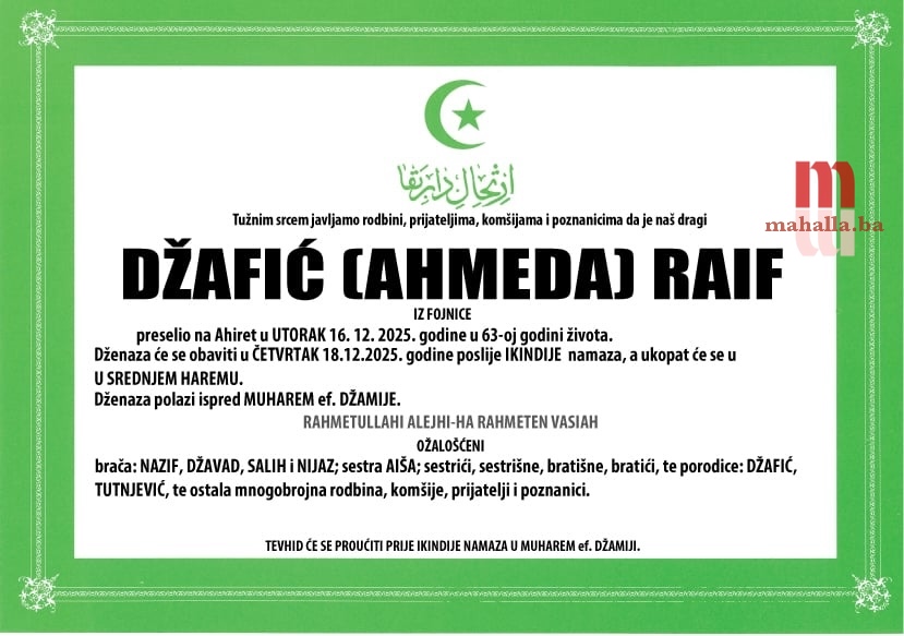 Dženaza-namaz će se klanjati i ukop obaviti u četvrtak, 18.12.2025. godine, poslije ikindije-namaza, na Srednjem haremu.