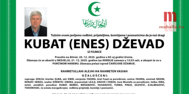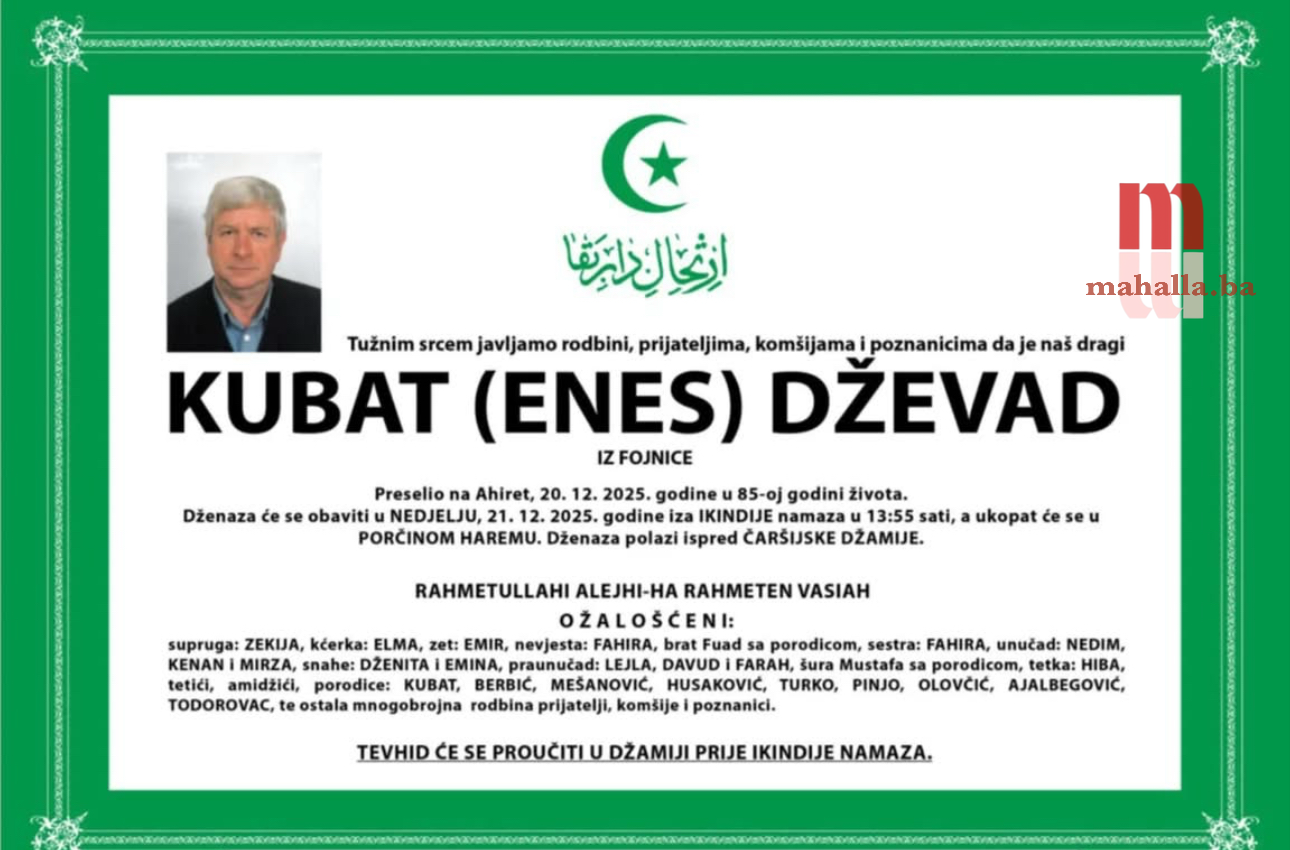 Dženaza-namaz će se obaviti u nedjelju, 21. 12. 2025. godine, poslije ikindije-namaza u 13:55 sati, a ukop će se obaviti u Porčinom haremu.
