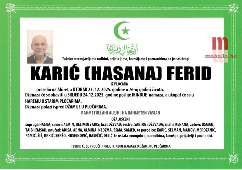 Na Bolji svijet je preselio KARIĆ (Hasana) FERID iz Pločara.