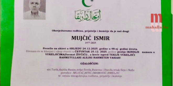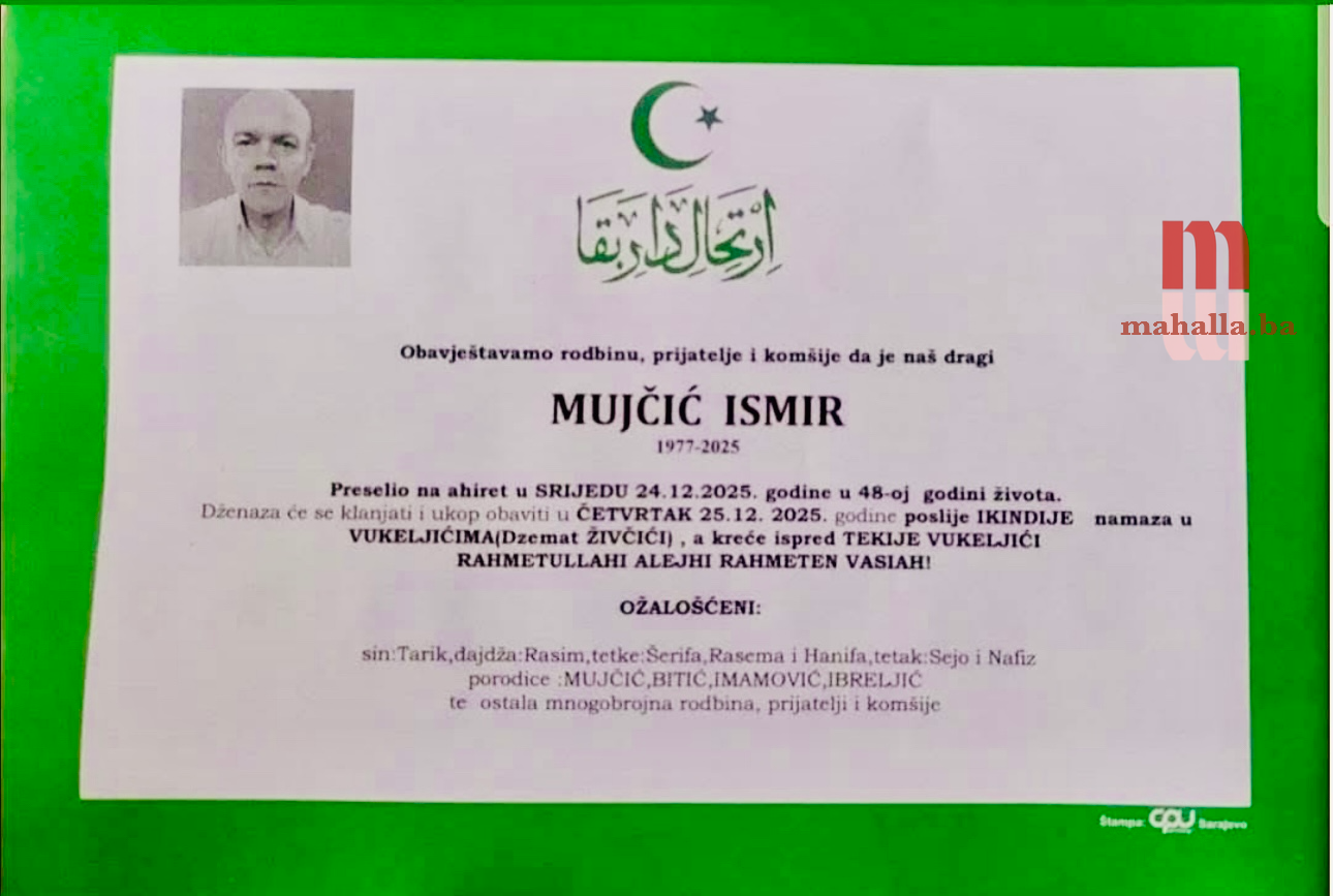 Dženaza-namaz će se klanjati i ukop obaviti u četvrtak, 25. 12. 2025. godine, poslije ikindije-namaza, na mezarju u Vukeljićima (džemat Živčići).
