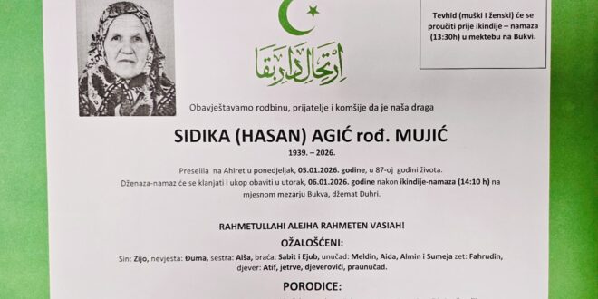 Dženaza-namaz će se klanjati i ukop obaviti u utorak, 06.01.2026. godine, nakon ikindije-namaza (14:10 h), na mjesnom mezarju Bukva, džemat Duhri.