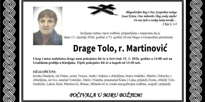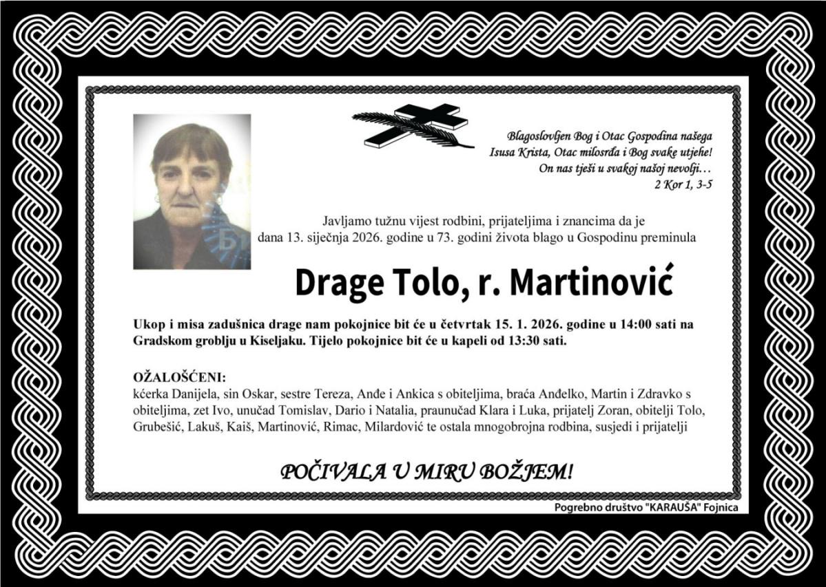 Preminula je Drage Tolo, rođ. Martinović u 73. godini života.