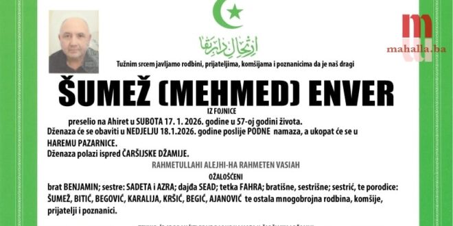 Na Bolji svijet je preselio ŠUMEŽ (MEHMED) ENVER iz Fojnice.