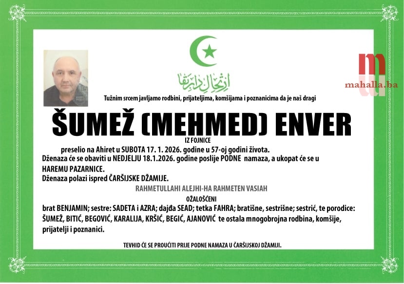 Dženaza-namaz će se obaviti u nedjelju, 18. 1. 2026. godine, poslije podne-namaza, a ukop će se obaviti u haremu Pazarnice.