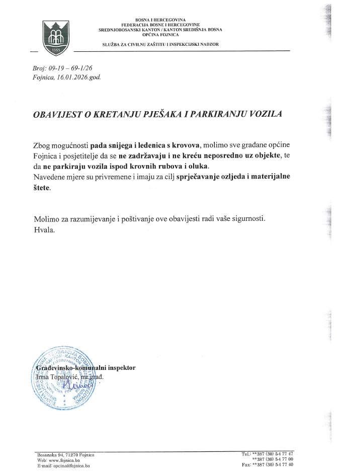 Zbog mogućnosti obrušavanja snijega i ledenica s krovova objekata, iz Općine Fojnica upućen je apel građanima i posjetiteljima da se ne zadržavaju niti kreću neposredno uz objekte, kao i da ne parkiraju vozila ispod krovnih rubova i oluka.