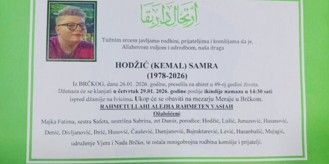 Dženaza-namaz će se klanjati u četvrtak, 29. 01. 2026. godine, poslije ikindije-namaza u 14:30 sati, ispred džamije na Ivicima, a ukop će se obaviti na mezarju Meraje u Brčkom.
