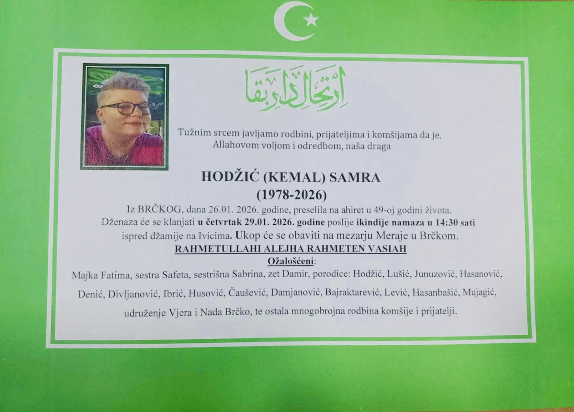 Na Bolji svijet je preselila HODŽIĆ (Kemal) SAMRA iz Brčkog.