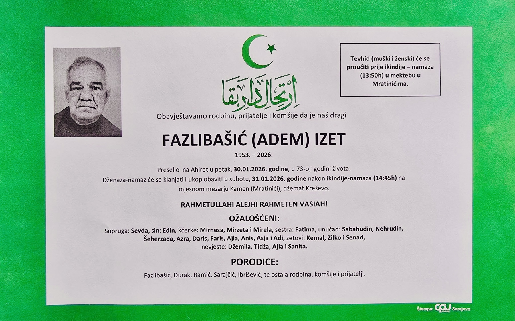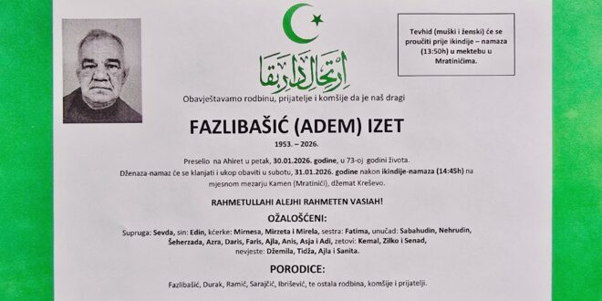 Dženaza-namaz će se klanjati i ukop obaviti u subotu, 31. 01. 2026. godine, poslije ikindije-namaza (14:45 sati) na mjesnom mezarju Kamen (Mratinići), džemat Kreševo.
