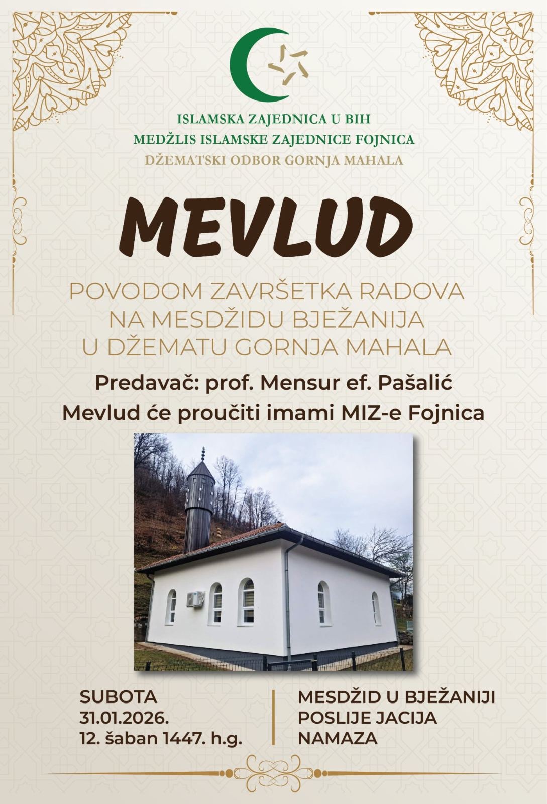 Večeras je u mesdžidu Bježanija, u džematu Gornja Mahala, održan mevlud povodom završetka radova adaptacije ovog vjerskog objekta, čija ukupna vrijednost iznosi 60.000 KM.