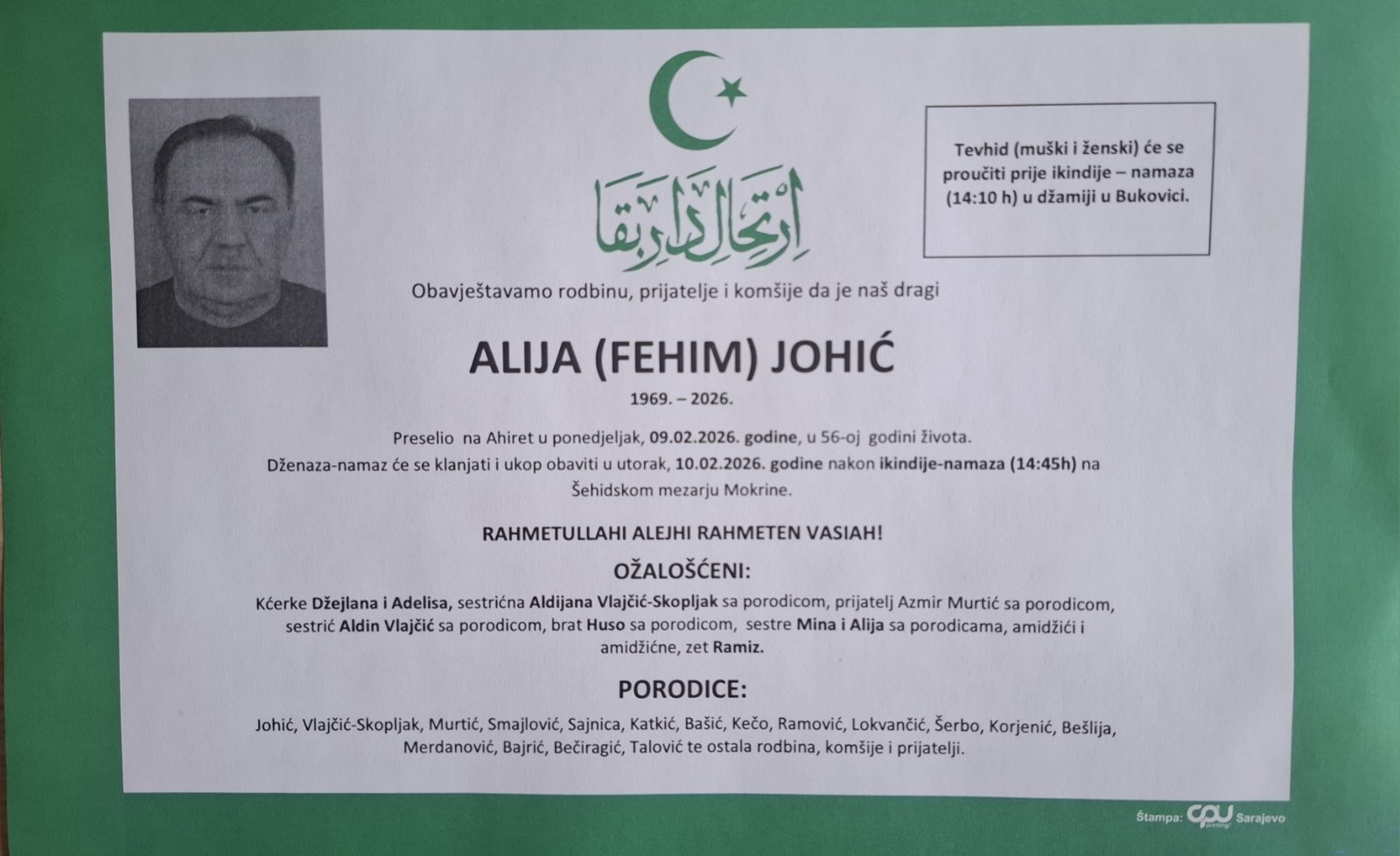 Preselio je na Ahiret u ponedjeljak, 09.02.2026. godine, u 56. godini života.