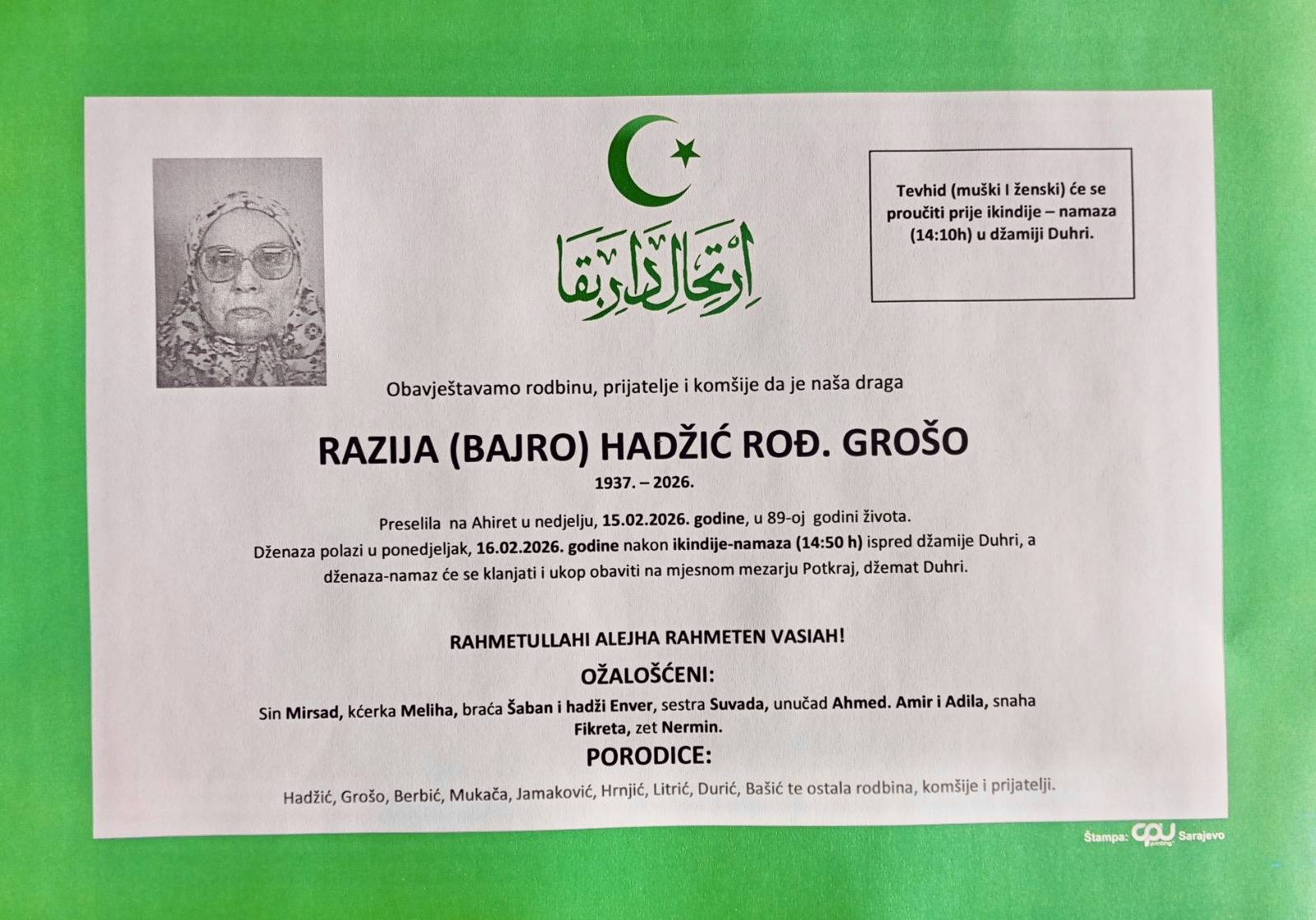 Dženaza polazi u ponedjeljak, 16.02.2026. godine, poslije ikindije-namaza (14:50 h) ispred džamije u Duhri, a dženaza-namaz će se klanjati i ukop obaviti na mjesnom mezarju Potkraj, džemat Duhri.