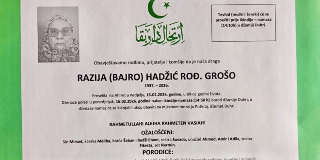Dženaza polazi u ponedjeljak, 16.02.2026. godine, poslije ikindije-namaza (14:50 h) ispred džamije u Duhri, a dženaza-namaz će se klanjati i ukop obaviti na mjesnom mezarju Potkraj, džemat Duhri.