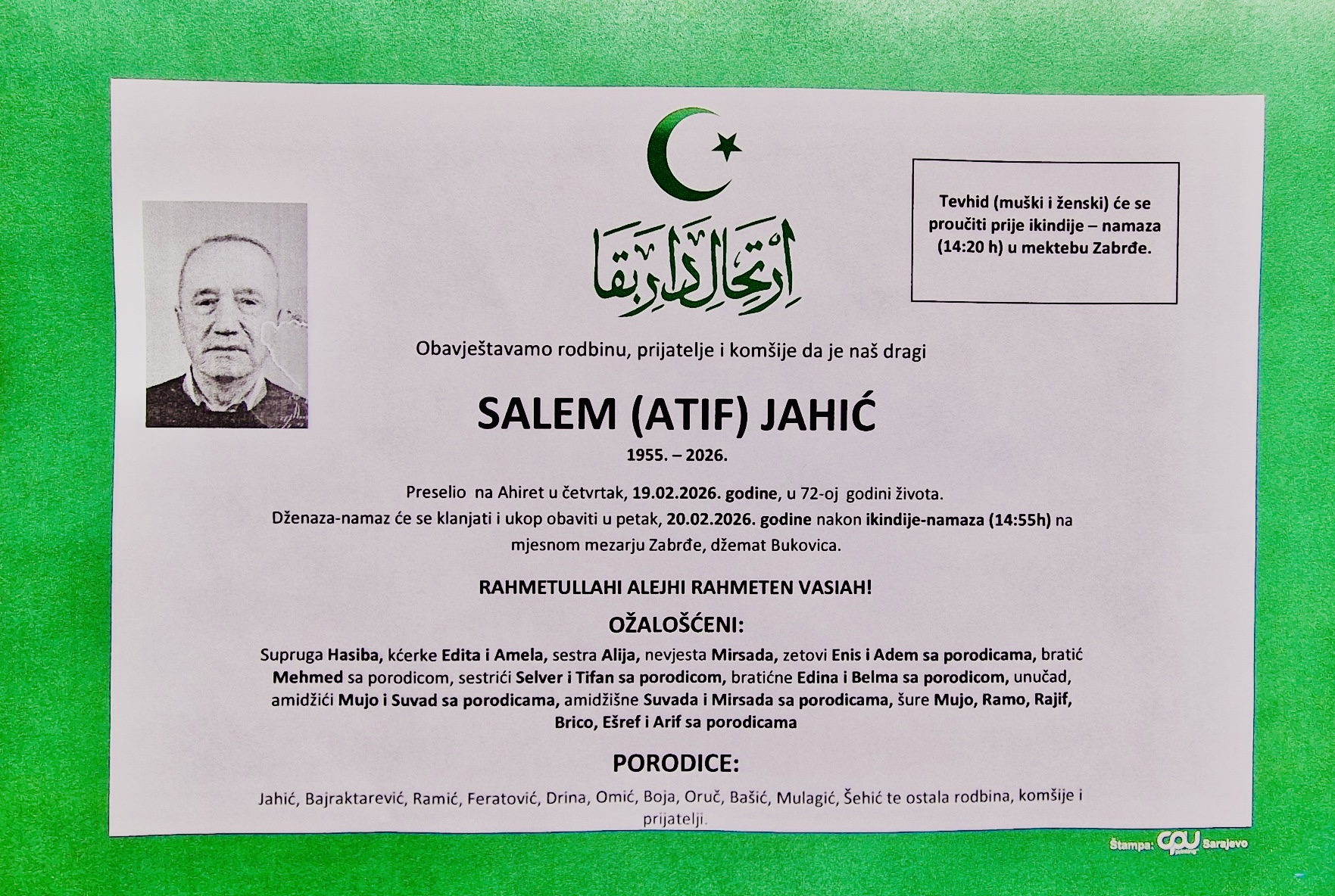 Dženaza-namaz će se klanjati i ukop obaviti u petak, 20.02.2026. godine, nakon ikindije-namaza (14:55 h) na mjesnom mezarju Zabrđe, džemat Bukovica.