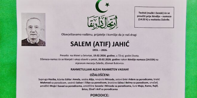 Dženaza-namaz će se klanjati i ukop obaviti u petak, 20.02.2026. godine, nakon ikindije-namaza (14:55 h) na mjesnom mezarju Zabrđe, džemat Bukovica.