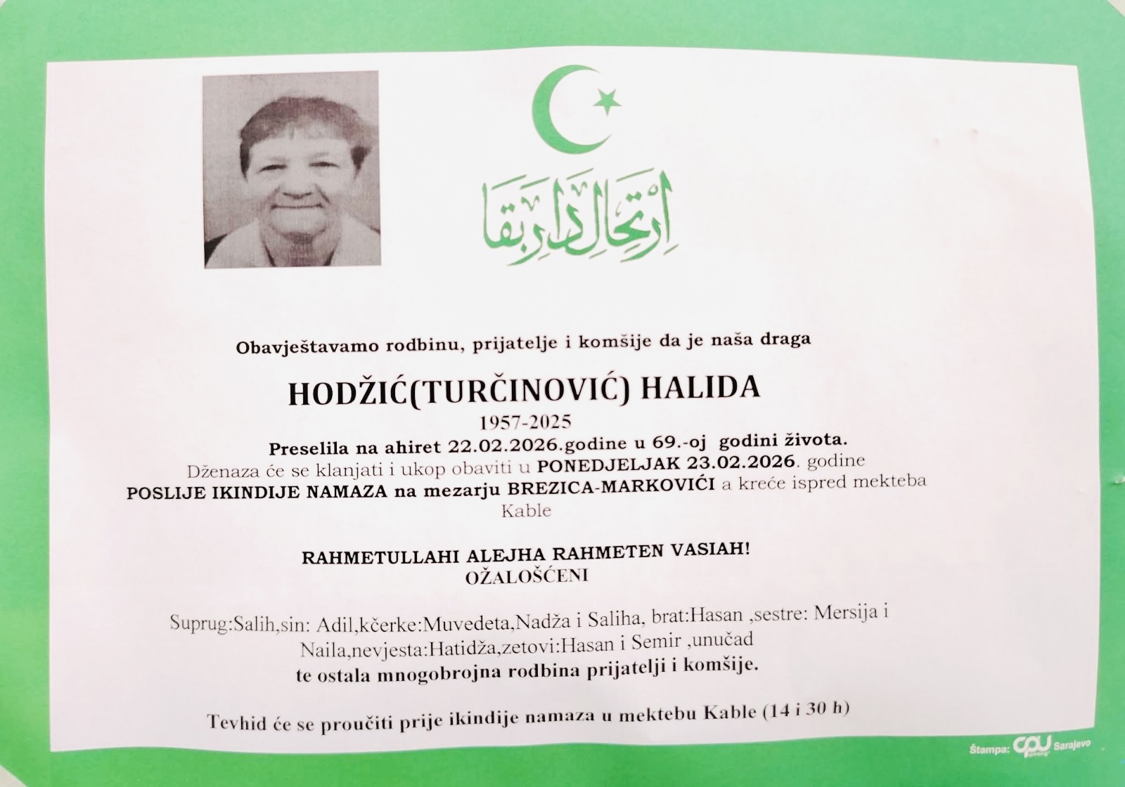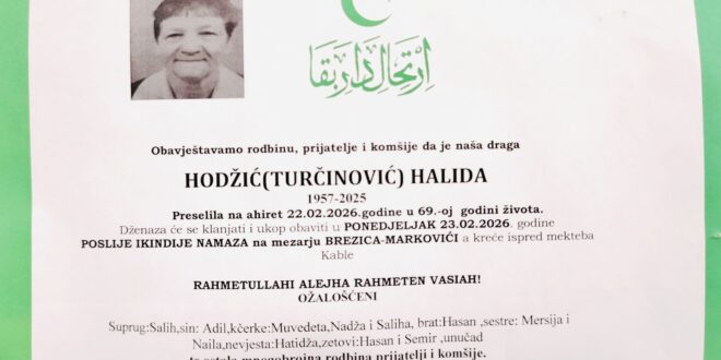 Dženaza-namaz će se klanjati i ukop obaviti u ponedjeljak, 23.02.2026. godine, poslije ikindije-namaza na mezarju Brezica–Markovići, a dženaza polazi ispred mekteba u Kablama.