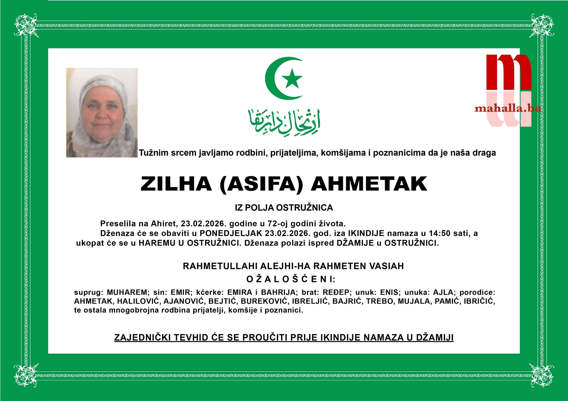 Na Bolji svijet je preselila ZILHA (ASIFA) AHMETAK iz Polja Ostružnica.