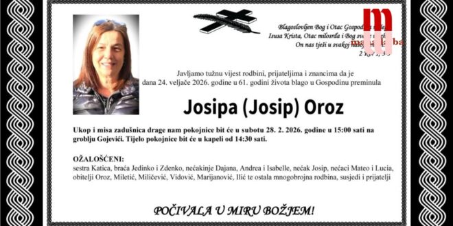 Preminula je Josipa (Josip) Oroz iz Fojnice u 61. godini života.