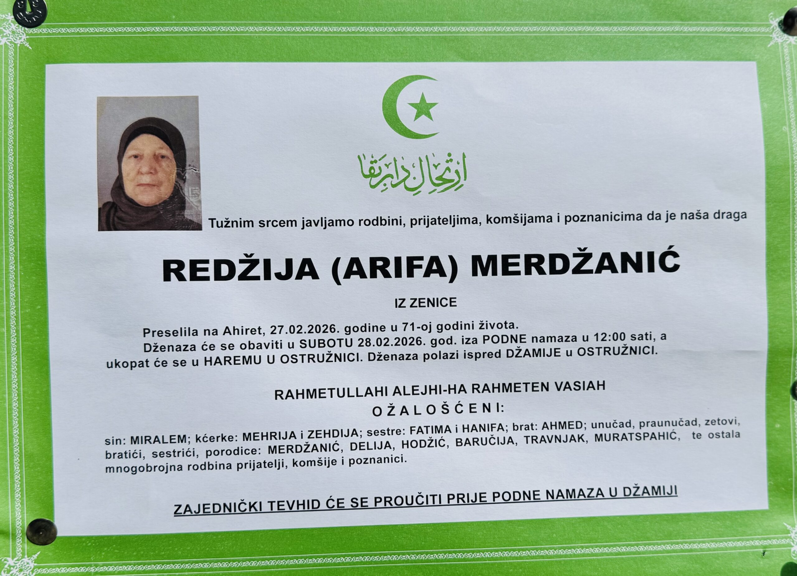 Dženaza će se obaviti u subotu, 28.02.2026. godine, iza podne-namaza u 12:00 sati, a ukopat će se u haremu u Ostružnici.