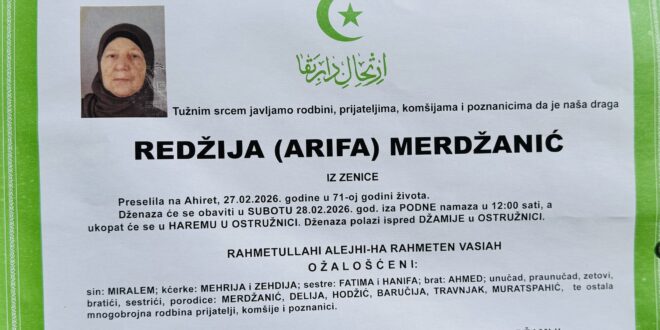 Dženaza će se obaviti u subotu, 28.02.2026. godine, iza podne-namaza u 12:00 sati, a ukopat će se u haremu u Ostružnici.