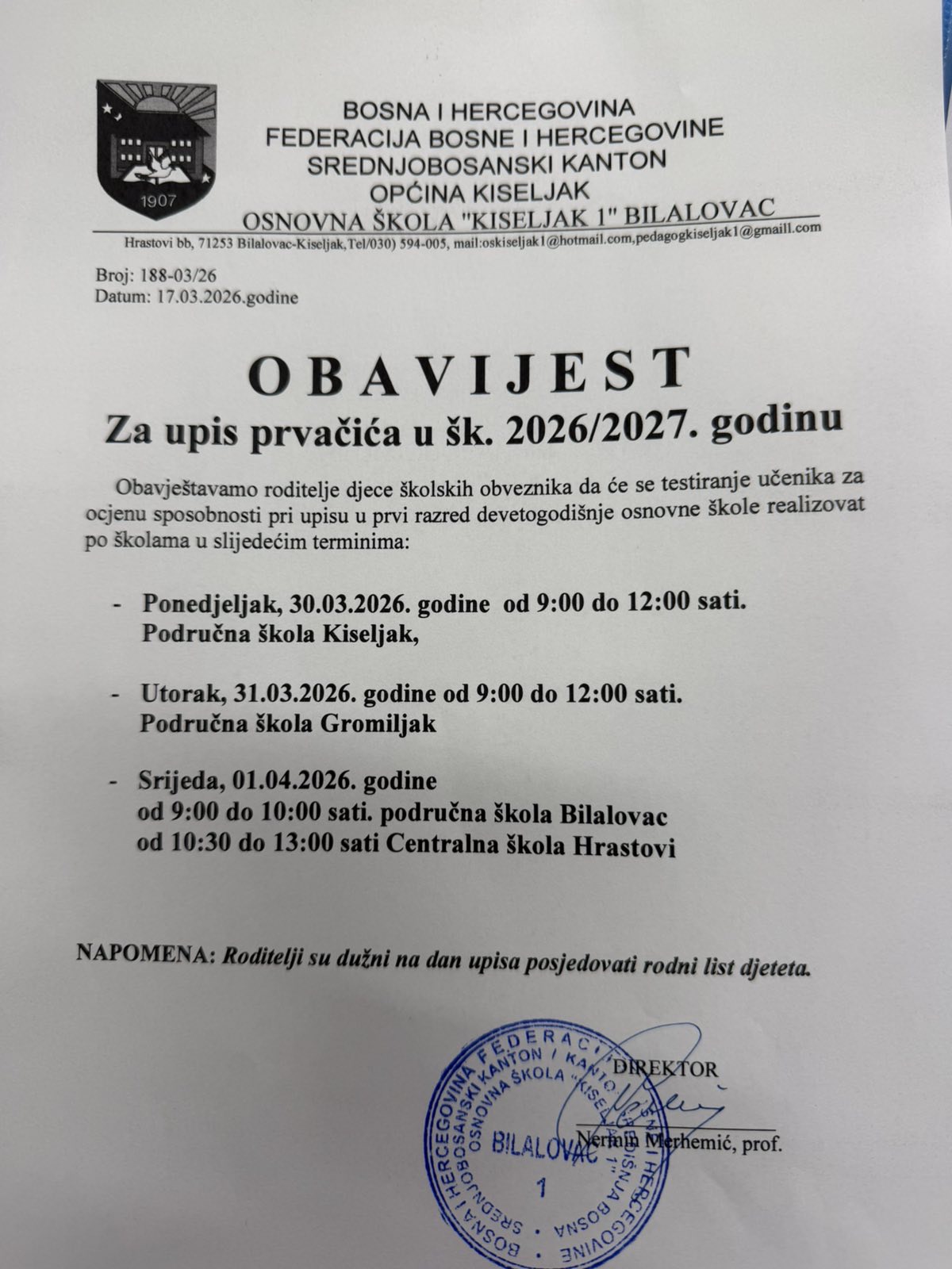 KISELJAK – Osnovna škola “Kiseljak 1” Bilalovac objavila je obavijest o upisu prvačića za školsku 2026/2027. godinu, kao i raspored testiranja djece dorasle za polazak u prvi razred.