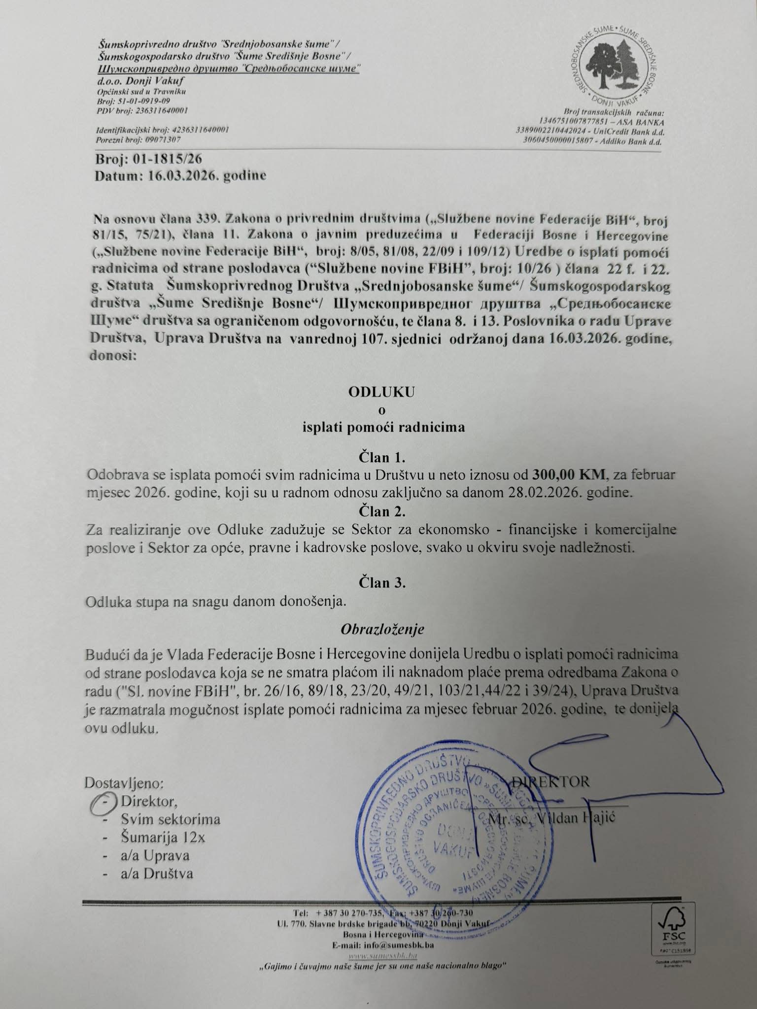 Donji Vakuf – Uprava Šumskoprivrednog društva „Srednjobosanske šume“ / „Šume Središnje Bosne“ d.o.o. Donji Vakuf donijela je odluku o isplati novčane pomoći svim radnicima u iznosu od 300 KM, za mjesec februar 2026. godine.