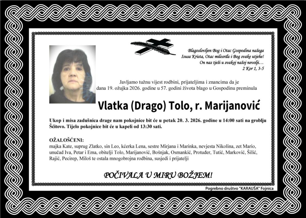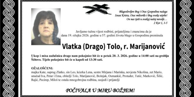 Preminula je Vlatka (Drago) Tolo, rođ. Marijanović iz Šćitova u 57. godini života.