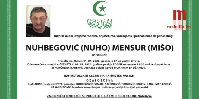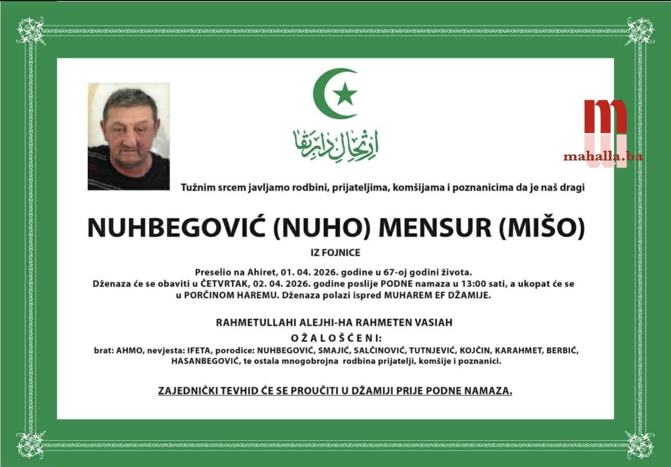 Nuhbegović (Nuho) Mensur (Mišo) iz Fojnice preselio je na Ahiret u srijedu, 1. aprila 2026. godine, u 67. godini života.