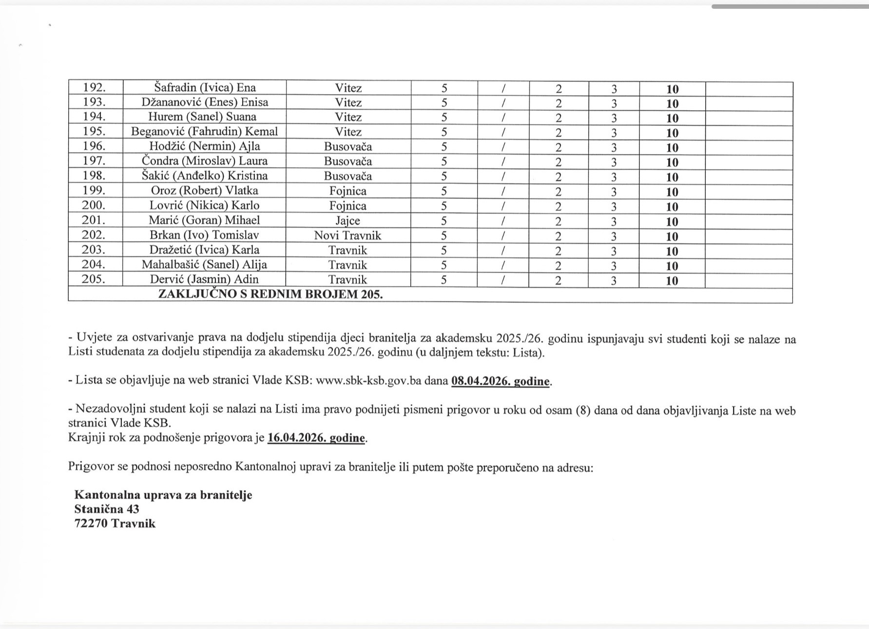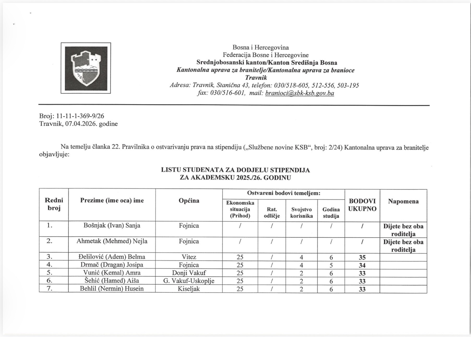 Kantonalna uprava za branioce Srednjobosanskog kantona objavila je listu studenata koji su ostvarili pravo na stipendiju za akademsku 2025./2026. godinu, a među dobitnicima nalazi se i značajan broj studenata iz Fojnice.