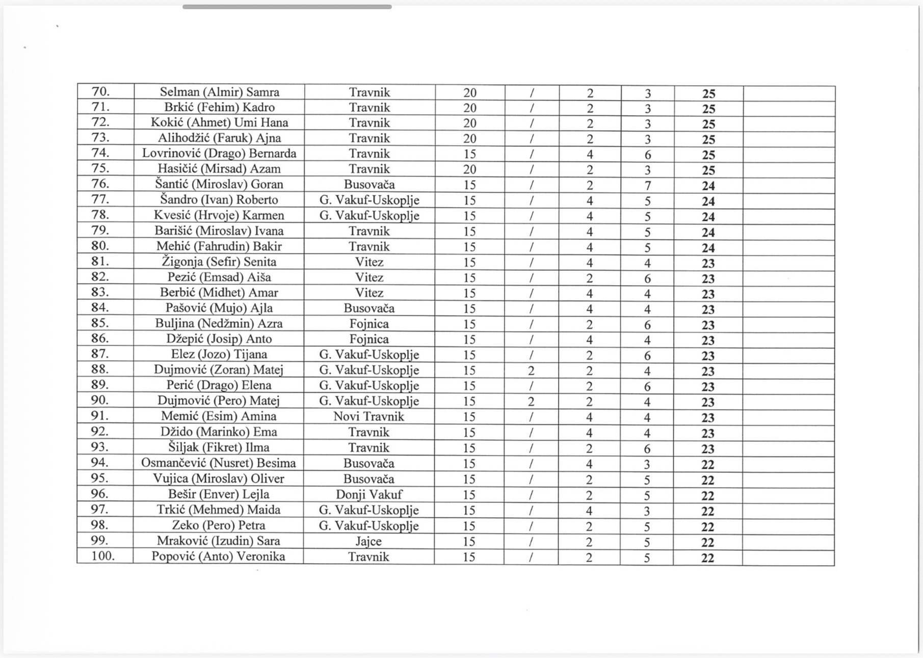 Prema objavljenoj listi, stipendije su dobili sljedeći Fojničani: Sanja Bošnjak, Nejla Ahmetak, Josipa Drmač, Amila Klisura, Amra Merdžanić, Ana Knežević, Azra Buljina, Anto Džepić, Selma Ahmedić, Ismail Kršić, Sara Bošnjak, Ilma Orman, Ajša Memija, Petar Krajinović, Vlatka Oroz i Karlo Lovrić.