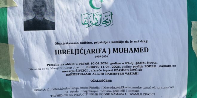 Dženaza-namaz će se klanjati i ukop obaviti u subotu, 11.04.2026. godine, poslije podne-namaza, na mezarju Živčići, a dženaza polazi ispred džamije u Živčićima.