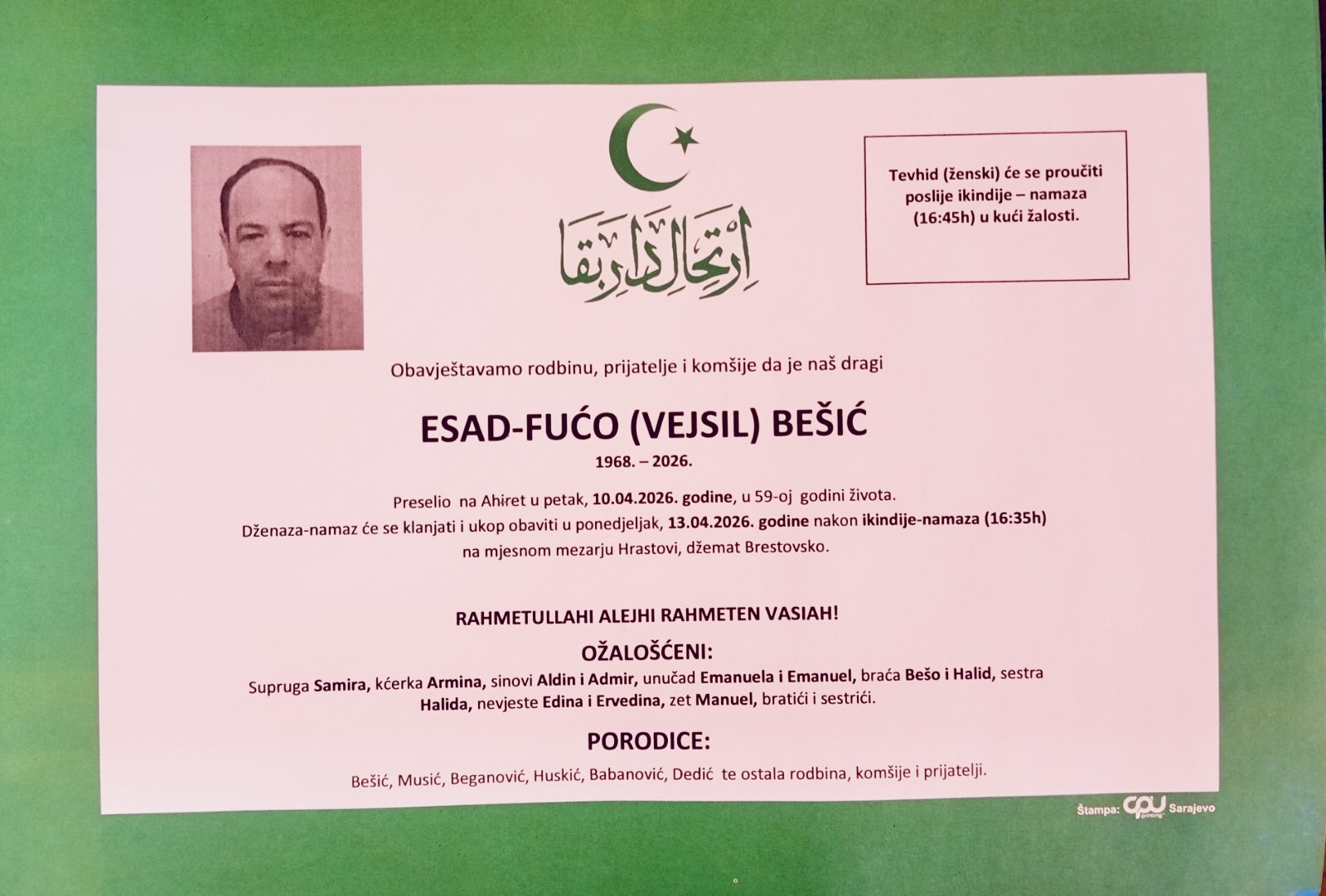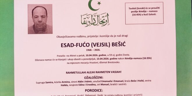 Dženaza-namaz će se klanjati i ukop obaviti u ponedjeljak, 13.04.2026. godine nakon ikindije-namaza u 16:35 sati, na mjesnom mezarju Hrastovi, džemat Brestovsko.