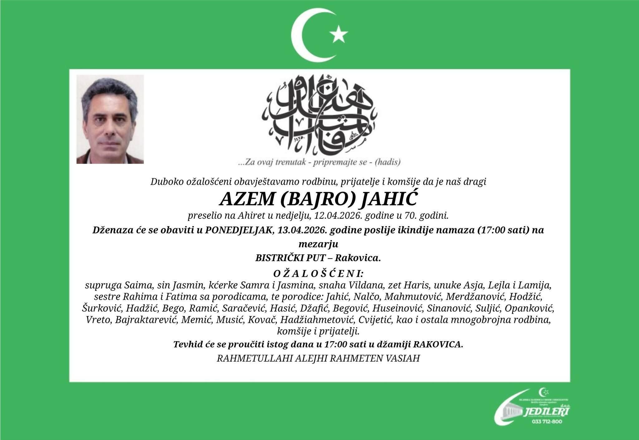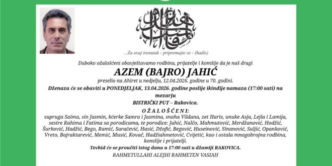 Na Ahiret je u nedjelju, 12. aprila 2026. godine, u 70. godini života preselio Azem (Bajro) Jahić.