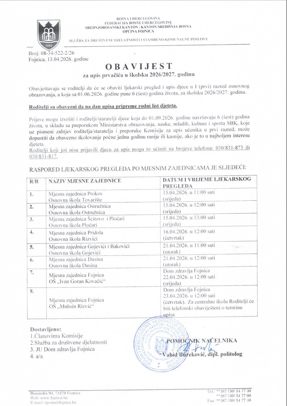 Općina Fojnica objavila je obavijest o upisu djece u prvi razred osnovne škole za školsku 2026/2027. godinu, uz detaljan raspored ljekarskih pregleda po mjesnim zajednicama.