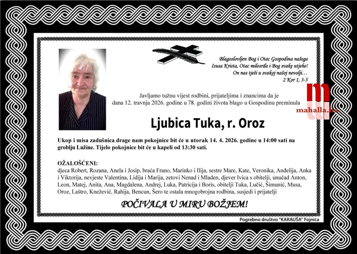 Preminula je LJUBICA TUKA, rođ. Oroz iz Fojnice u 78. godini života.