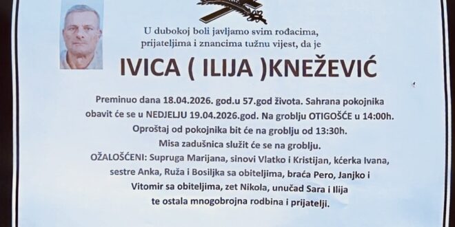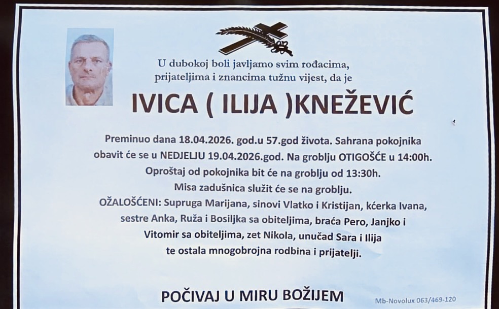 Sahrana pokojnika obavit će se u NEDJELJU 19.04.2026. godine na groblju OTIGOŠĆE u 14:00h.