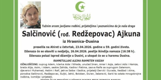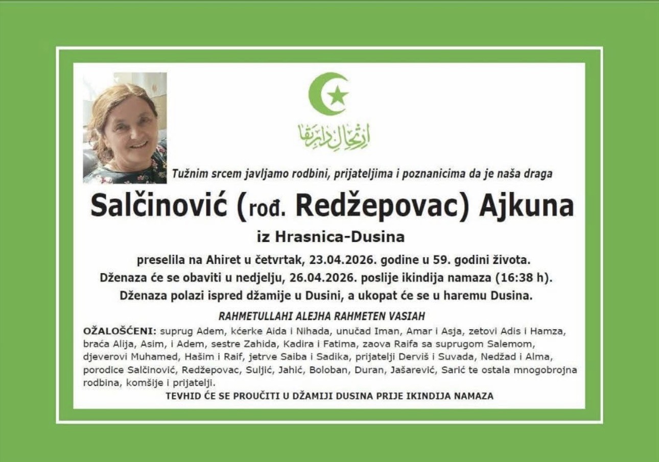 Dženaza će se obaviti u nedjelju, 26.04.2026. godine poslije ikindija-namaza (16:38 h).
