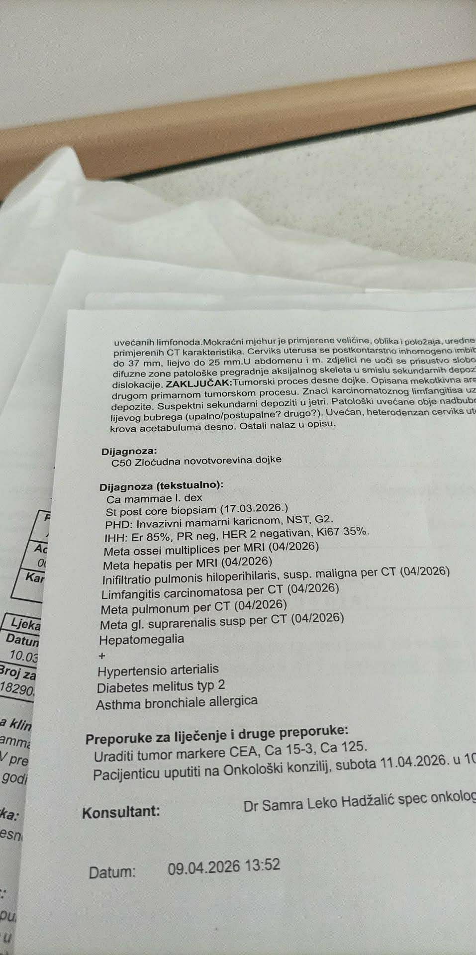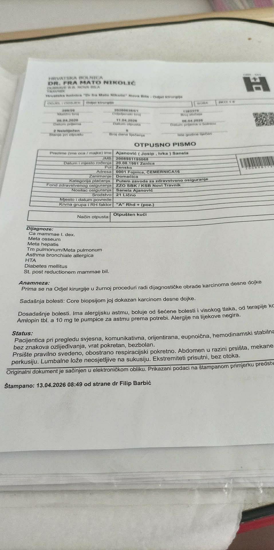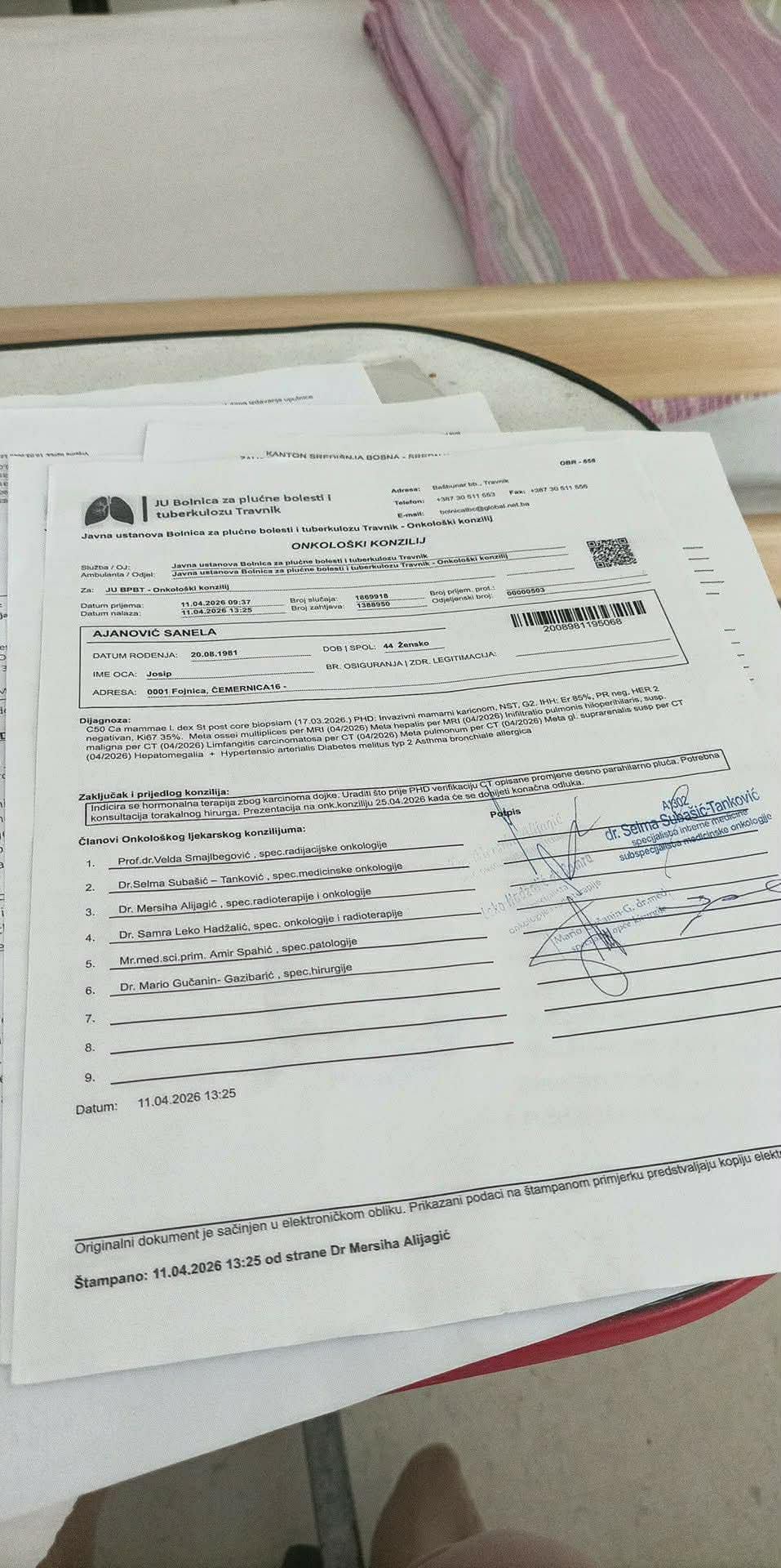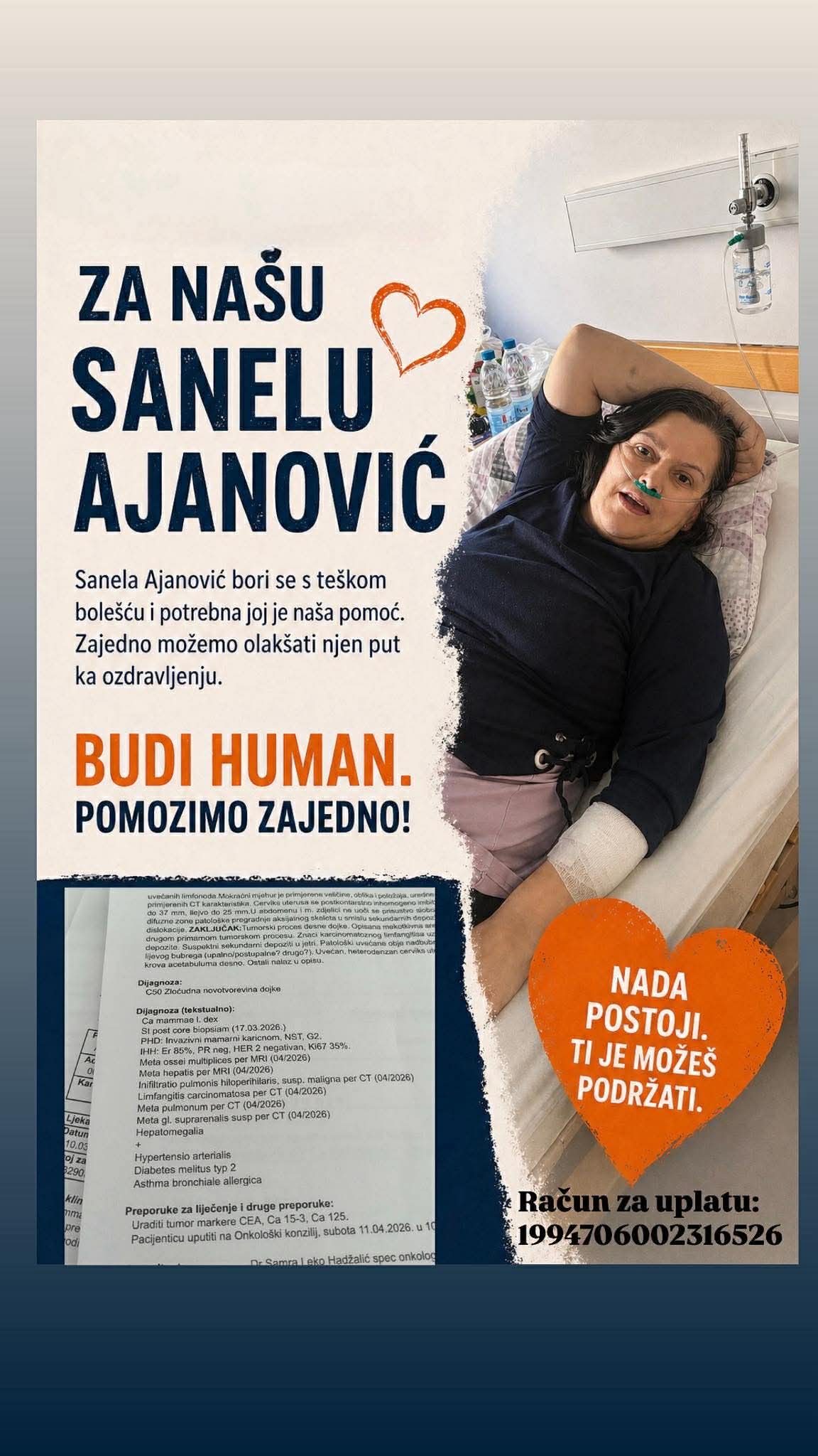 Sanela se trenutno nalazi na liječenju, a osim borbe s teškom bolešću, suočava se i s dodatnim izazovima koje ovakva dijagnoza nosi. Uprkos svemu, nada postoji – ali joj je potrebna pomoć dobrih ljudi.