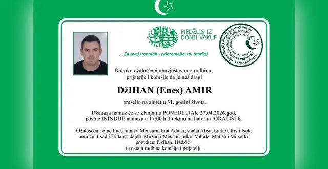 Dženaza-namaz će se obaviti danas poslije ikindije namaza na haremu “Igralište”, a bit će organizovan i prijevoz za Donji Vakuf.