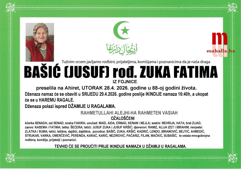Na Bolji svijet je preselila BAŠIĆ (JUSUF), rođ. ZUKA FATIMA iz Fojnice.