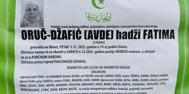 Na Bolji svijet je preselila ORUČ – DŽAFIĆ (AVDE) hadži FATIMA iz Fojnice. Preselilaje na Ahiret u petak, 5.12.2025. godine, u 74. godini života. Dženaza-namaz će se obaviti u subotu, 6.12.2025. godine, poslije ikindije-namaza, a ukop će se obaviti na Porčinom haremu. Dženaza polazi ispred Pavlovačke džamije. RAHMETULLAHI ALEJHA RAHMETEN …