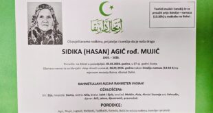 Na Bolji svijet je preselila SIDIKA (HASAN) AGIĆ, rođ. MUJIĆ iz Kreševa. Preselila je na Ahiret u ponedjeljak, 05.01.2026. godine, u 87. godini života. Dženaza-namaz će se klanjati i ukop obaviti u utorak, 06.01.2026. godine, nakon ikindije-namaza (14:10 h), na mjesnom mezarju Bukva, džemat Duhri. RAHMETULLAHI ALEJHA RAHMETEN VASIAH! OŽALOŠĆENI:sin …