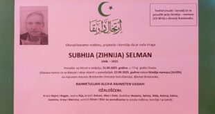 Na Bolji svijet je preselila SUBHIJA (ZIHNIJA) SELMAN iz Kiseljaka. Preselila je na Ahiret u nedjelju, 21.09.2025. godine, u 77-oj godini života. Dženaza-namaz će se klanjati i ukop obaviti u ponedjeljak, 22.09.2025. godine nakon ikindije-namaza (16:05 h) na mjesnom mezarju Brestovsko (mezarje kod džamije), džemat Brestovsko. RAHMETULLAHI ALEJHA RAHMETEN VASIAH! …